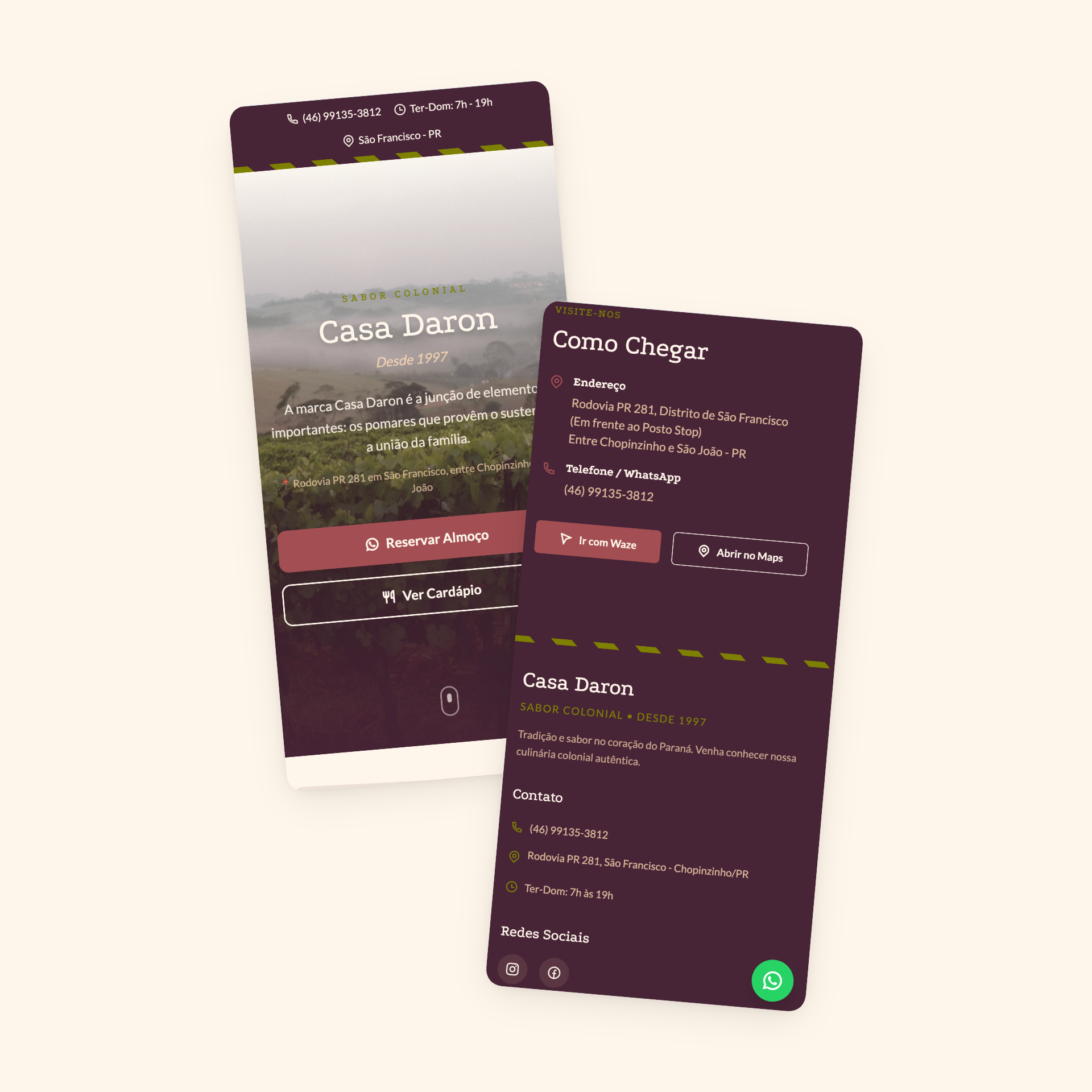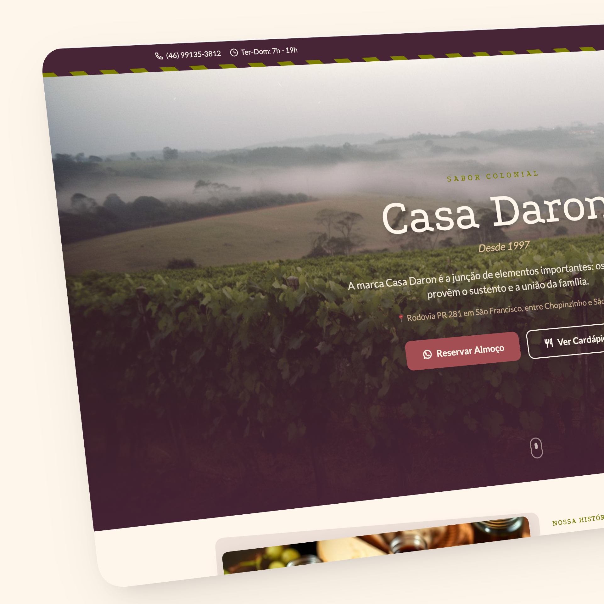 Casa Daron, a traditional restaurant and colonial product emporium with over 27 years of history, needed to modernize its digital presence without losing its welcoming and familiar essence. The main obstacle was digitizing access to the establishment's information—strategically located on the PR-281 highway, between Chopinzinho and São João—to attract both travelers and local residents. It was necessary to organize the menu, highlight the quality of fresh products, and, most importantly, simplify and organize the reservation flow for lunches and product orders, which until then lacked a centralized and attractive digital storefront.