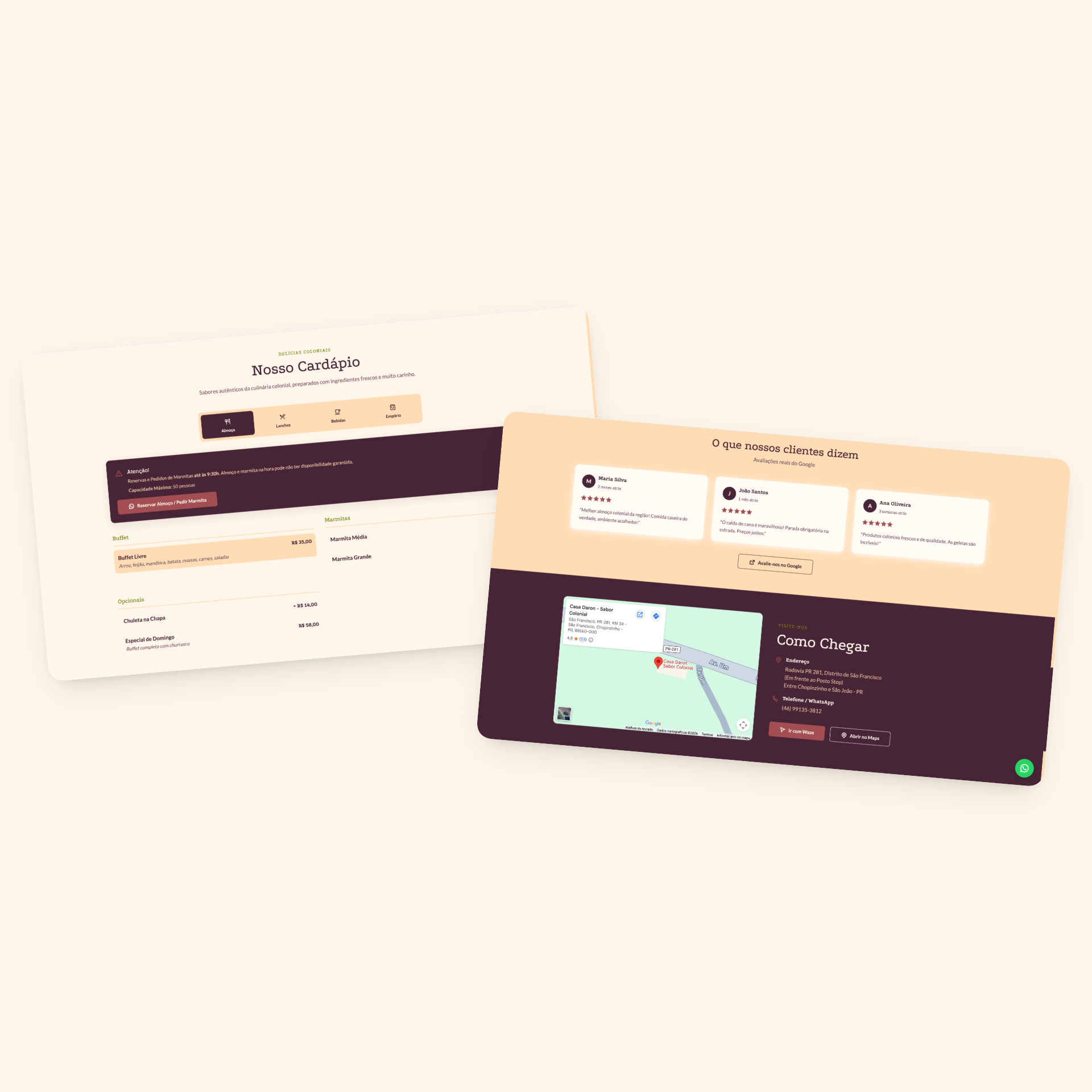 We solved the service flow by integrating direct action buttons to WhatsApp, which optimized advance lunch reservations (until 9:30 AM), meal box (marmita) orders, and the personalized assembly of baskets in the emporium. Furthermore, we facilitated the arrival of new customers by integrating direct routes to Waze and Google Maps and applied SEO techniques aimed at local commerce. The result is a practical and welcoming digital environment that attracts more physical visitors and preserves the close relationship with the customer.