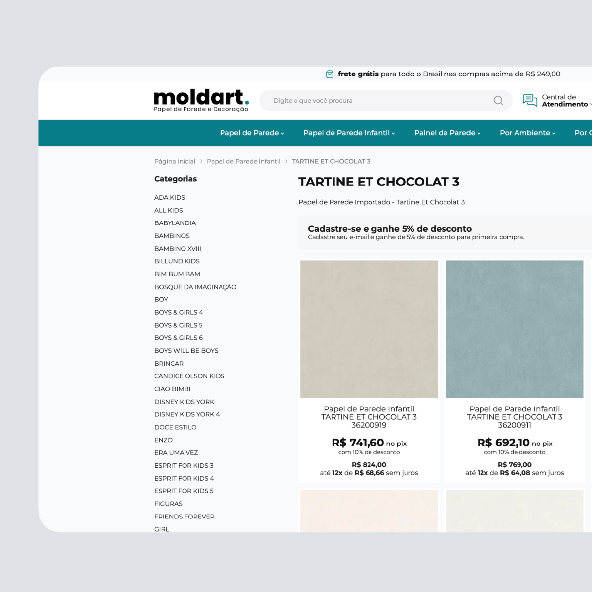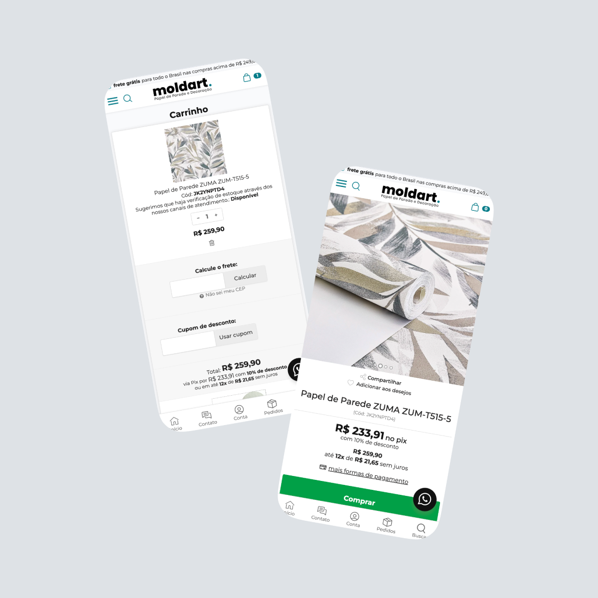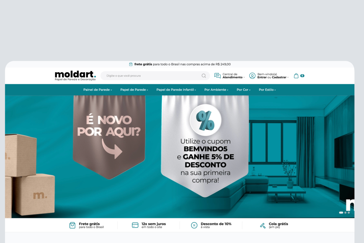 Moldart Papel de Parede, referencia en papeles pintados, necesitaba una plataforma digital que reflejara la elegancia de sus productos y ofreciera una experiencia de compra impecable. El gran obstáculo era organizar un catálogo amplio — con miles de variaciones de estilos, colores y ambientes — de manera que la navegación fuera fluida y no abrumara al usuario. Además, existía el desafío técnico de integrar reglas complejas de envío y logística, garantizando que el cálculo de envío y los plazos fueran precisos y transparentes para los clientes de todo Brasil.